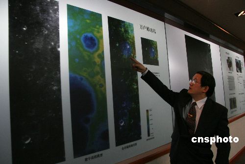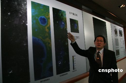 十二月十一日,中國繞月探測工程地面應(yīng)用系統(tǒng)總設(shè)計師李春來,向媒體介紹“嫦娥一號”衛(wèi)星CCD相機(jī)對月球背面進(jìn)行成像探測所獲取的“萬戶撞擊坑”。以中國明代人萬戶命名的“萬戶撞擊坑”直徑五十二公里,位于月球背面南緯九點(diǎn)八度、西經(jīng)一百三十八點(diǎn)八度區(qū)域,地球上不能直接看到。中國國家航天局當(dāng)天發(fā)布信息稱,目前,“嫦娥一號”衛(wèi)星的飛行、有效載荷的探測、地面的測控與通信、數(shù)據(jù)接收與處理均正常,衛(wèi)星CCD相機(jī)已對月球背面進(jìn)行成像探測,并獲取月球背面部分區(qū)域的影像圖。中新社發(fā) 孫自法 攝
