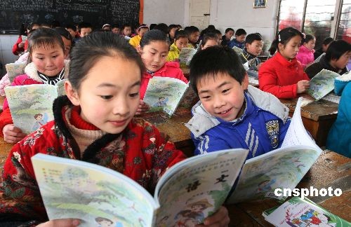 2月20日,六安市金安區(qū)人民路小學(xué)五年級學(xué)生在閱讀新課本。當(dāng)日,在經(jīng)受50年不遇暴雪災(zāi)害的大別山老區(qū)安徽省六安市,各中小學(xué)校的學(xué)生們領(lǐng)到新課本,如期開學(xué)上課。雪災(zāi)發(fā)生后,當(dāng)?shù)攸h委、政府采取多種措積極施維修雪毀校舍,嚴(yán)格執(zhí)行收費(fèi)政策,免去城區(qū)學(xué)生的學(xué)雜費(fèi)和部分下崗特困戶子女的課本作業(yè)費(fèi),農(nóng)村學(xué)生費(fèi)用全免,保障災(zāi)后教學(xué)工作正常進(jìn)行。中新社發(fā) 陳超平 攝