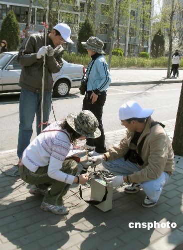 4月3日,北京林業(yè)大學氣象專業(yè)研究生在西城區(qū)甘家口街旁利用儀器,實習監(jiān)測地面高度四至五米高度的空氣質量。據(jù)操控儀器的學生介紹,測量是為了采集畢業(yè)論文數(shù)據(jù),當日所檢測到的數(shù)據(jù)值均為良好。據(jù)北京市環(huán)境保護監(jiān)測中心日前發(fā)布的消息,3月份北京市收獲了19個藍天,使一季度空氣質量達標天累計達67天,占73.6%,比去年增加了12天,為九年來歷史同期最好水平,空氣質量的改善,林木覆蓋率的增加,見證了北京對綠色奧運的承諾。 中新社發(fā) 鄒憲 攝