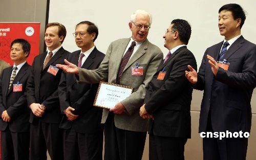 四月九日,全球500強、世界領先的多元化高科技制造企業(yè)霍尼韋爾公司攜手北京航空航天大學,共同拉開2008年霍尼韋爾—諾貝爾全球校園行的序幕。諾貝爾物理獎獲得者謝爾登·格拉肖博士(右三)親臨現場為學子們講授了他的學術成果和科研心得,與學生們進行了面對面的交流。霍尼韋爾—諾貝爾全球校園行活動由霍尼韋爾公司發(fā)起,旨在全球范圍內提升高?茖W教育、培養(yǎng)高素質科技創(chuàng)新人才的社會公益活動。中新社發(fā) 任海霞 攝