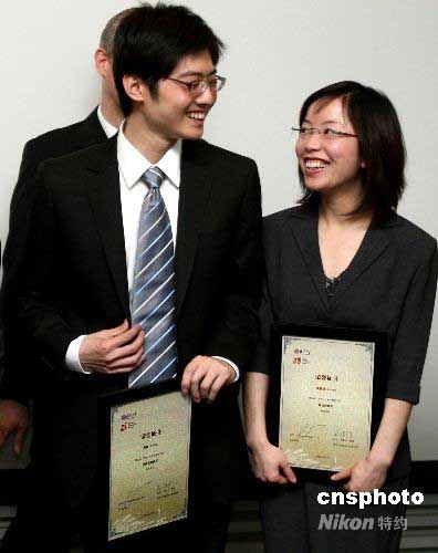 5月7日,清華大學“清華-杜孟傳播獎學金”頒獎典禮上,獲得此項獎勵“最佳創(chuàng)意獎”的清華學生侯青楊(右)、“優(yōu)秀策劃案獎”得主張棟同學,分別獲得赴瑞士日內(nèi)瓦和泰國曼谷的聯(lián)合國愛滋病規(guī)劃署實習3個月的機會。這兩位清華學生將與世界各地專業(yè)人士一起為解決世界和中國可能發(fā)生的由愛滋病引起的嚴重健康危機而工作。中新社發(fā) 宋吉河 攝