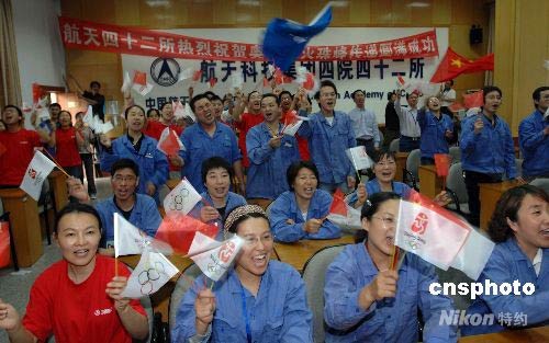 圖:航天人歡慶“祥云”圣火飄珠峰