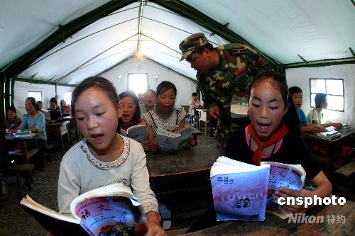 成都軍區(qū)駐渝某集團(tuán)軍官兵步行100余公里進(jìn)入茂縣后,進(jìn)村入戶組得知受5月12日地震的破壞,四川省茂縣宗渠村小的教學(xué)樓、住宿樓倒塌。學(xué)校的302名學(xué)生被迫停課。他們立即組織官兵搭制帳篷小學(xué),逐家逐戶走訪并告訴家長(zhǎng)讓學(xué)生到帳篷小學(xué)上課,5月24日上午10時(shí),在帳篷小學(xué)校長(zhǎng)、駐渝某團(tuán)代副團(tuán)長(zhǎng)嚴(yán)奎的宣布下,茂縣首座帳篷小學(xué)開(kāi)課。中新社發(fā) 高效文 攝