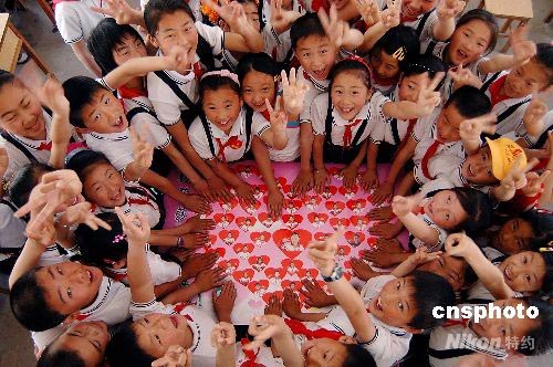 2008年5月30日,來自四川綿陽地震災(zāi)區(qū)、在日照市經(jīng)濟(jì)開發(fā)區(qū)第二小學(xué)上學(xué)的3名學(xué)生,在新學(xué)校與老師同學(xué)們歡慶“六一”兒童節(jié)。日照經(jīng)濟(jì)開發(fā)區(qū)第二小學(xué)的師生為3名同學(xué)送上精美禮物,祝福他們和四川地震災(zāi)區(qū)的小朋友節(jié)日快樂。近日,山東日照市教育部門安排3名投奔親友的四川地震災(zāi)區(qū)小學(xué)生就近在日照經(jīng)濟(jì)開發(fā)區(qū)二小上學(xué),學(xué)校為這3名學(xué)生捐贈(zèng)了學(xué)習(xí)用品,并減免費(fèi)用。中新社發(fā) 陳為峰 攝