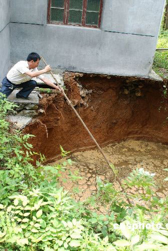 6月5日凌晨,江西省上饒市玉山縣一農(nóng)家屋角發(fā)生一起面積約三十平方米、深約六七米的地陷事件,工作人員正在探測(cè)地陷深度。此前,5月12日,四川汶川地震發(fā)生后半小時(shí),江西萍鄉(xiāng)市蘆溪縣一農(nóng)田也曾發(fā)生兩千平方米的地陷事件。當(dāng)日幾乎同時(shí),該市上栗縣也發(fā)生一起農(nóng)田大面積沉陷事件。專家初步分析,上述三起地陷主要是由當(dāng)?shù)氐刭|(zhì)結(jié)構(gòu)引起的,與四川地震無關(guān)。中新社發(fā) 劉樹楨 攝