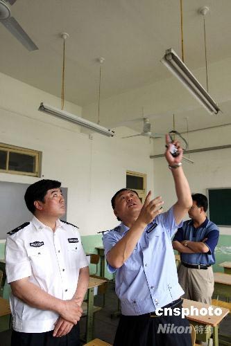 六月六日,2008年中國高考的最后準(zhǔn)備階段。從當(dāng)日下午起,北京各個高考點(diǎn)將進(jìn)行教室安全檢查、貼封條的最后階段,北京警方也投入力量對教室進(jìn)行最后的安全檢查,排除隱患,確保高考順利進(jìn)行。中新社發(fā) 任海霞 攝