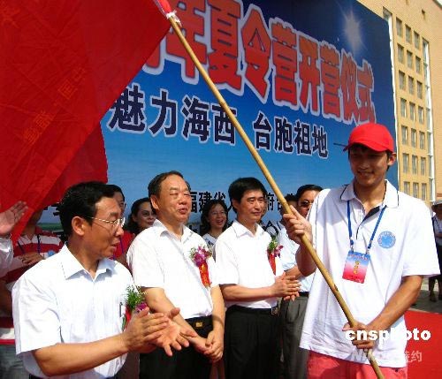 7月3日,海峽西岸2008年臺(tái)胞青年夏令營(yíng)在福州開營(yíng),福建省委常委、宣傳部長(zhǎng)唐國(guó)忠(左一)為夏令營(yíng)授旗。作為全國(guó)臺(tái)聯(lián)臺(tái)胞青年千人夏令營(yíng)的福建分營(yíng),本次夏令營(yíng)為期6天,吸引110多名臺(tái)胞青年參加。中新社發(fā) 林維莉 攝