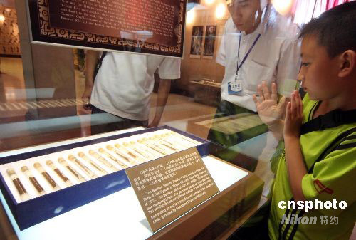 7月23日,北京中國軍事博物館舉行的“制勝之道——《孫子兵法》”展上,20片刻有《孫子兵法》的竹簡以特殊形態(tài)亮相。為保護(hù)這些竹簡,每片竹簡都保存在一個(gè)裝滿藥水的密閉管中。據(jù)介紹,這些竹簡是從3個(gè)不同墓坑中發(fā)掘的。中新社發(fā) 吳芒子 攝