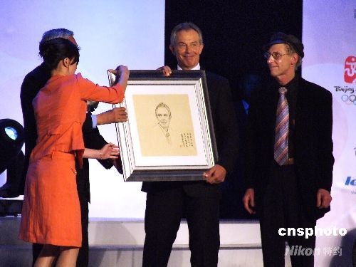 8月4日,由北京大學(xué)主辦的“2008奧運(yùn).冠軍論壇”在北京大學(xué)百年紀(jì)念講堂內(nèi)隆重開(kāi)幕。出席開(kāi)幕盛典的貴賓有英國(guó)前首相托尼.布萊爾、成龍、譚盾、揚(yáng)揚(yáng)、羅雪娟在內(nèi)的數(shù)十位中外嘉賓。圖為北京大學(xué)校長(zhǎng)許智宏向英國(guó)前首相托尼.布萊爾贈(zèng)送畫(huà)像。中新社發(fā) 鄭雄增 攝