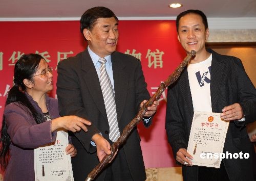 著名演員馮遠(yuǎn)征(右)在北京華僑飯店向中國(guó)華僑歷史博物館捐贈(zèng)百年木雕龍人頭拐杖,中國(guó)僑聯(lián)副主席李祖沛(中)接受捐贈(zèng)藏品。