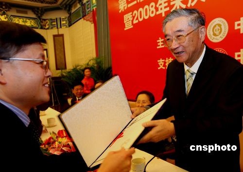 圖為中國宋慶齡基金會主席胡啟立(右)為“宋慶齡兒科醫(yī)學(xué)獎”獲獎?wù)哳C發(fā)獲獎證書。
