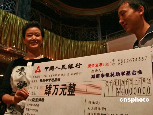 10月24日,湖南宋祖英助學(xué)基金會攜手人民銀行、湖南省婦聯(lián)、湖南省教育廳以及今日女報社,捐資65萬元,資助500名困難學(xué)生和10名教師,其中包括58名長郡中學(xué)理縣班學(xué)生和湖南大學(xué)、中南大學(xué)的20名來自四川災(zāi)區(qū)的大學(xué)生。湖南宋祖英助學(xué)基金會2006年5月登記成立,到目前為止,共捐資120余萬元,資助貧困學(xué)生、獎勵優(yōu)秀教師1000多人。中新社發(fā) 張家根 攝