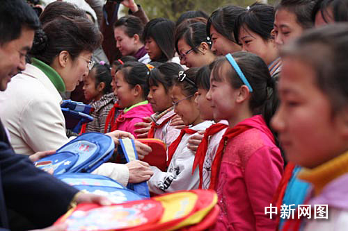 甘肅省人口委、共青團(tuán)甘肅省委、蘭州市政府官員為結(jié)對(duì)幫教的女大學(xué)生志愿者頒發(fā)證書(shū),為女童贈(zèng)送書(shū)包等。