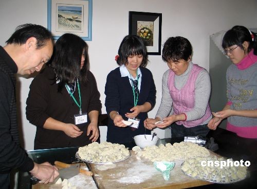 十二月二十一日,適逢中國農(nóng)歷傳統(tǒng)節(jié)日冬至,日本青少年友好使者代表團(tuán)一百名成員抵達(dá)西安,與當(dāng)?shù)刂袑W(xué)生進(jìn)行“民宿對接活動”。圖為陜西師范大學(xué)附中高一年級學(xué)生楊肖影(右一)一家,與日本學(xué)生市井亞子和寺本編繪在學(xué)習(xí)體驗包餃子。中新社發(fā) 冽瑋 攝