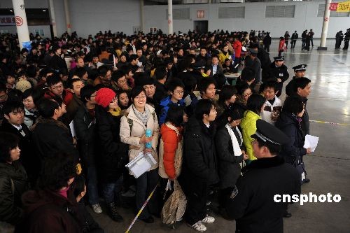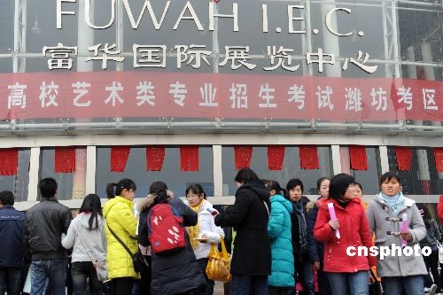 2009年2月4日,在山東濰坊富華國(guó)際展覽中心“藝考濰坊報(bào)名點(diǎn)”,參加2009年省外院校藝術(shù)專業(yè)考試的考生正在排隊(duì)報(bào)名。2009年藝考將于2月5日正式開考,歷時(shí)半個(gè)月。據(jù)了解,今年藝考山東省共報(bào)名96000人左右,濰坊市報(bào)名11000余人。中新社發(fā) 王志德 攝