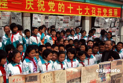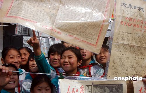 10月18日,山東省郯城縣港上鎮(zhèn)中心小學(xué)舉辦“光輝的歷程——慶祝黨的十七大勝利召開藏報(bào)展”,共展出退休教師丁思德珍藏的報(bào)道歷屆歷次“黨代會(huì)”的各類報(bào)紙177份。黨的光輝歷程激發(fā)了師生們的愛國(guó)熱情。中新社發(fā) 房德華 攝