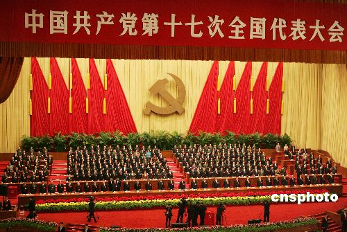 10月21日中午,中共十七大在北京人民大會(huì)堂完成各項(xiàng)議程,在軍樂團(tuán)演奏的《國際歌》樂曲中閉幕。中新社發(fā) 任晨鳴 攝