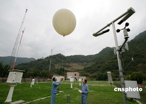 10月22日,西昌衛(wèi)星發(fā)射中心氣象室工作人員正在施放高空探測(cè)氣球,搜集高空風(fēng)速、風(fēng)向和云層的變化情況。該中心航天發(fā)射場(chǎng)氣象變化非常復(fù)雜,每年有一百二十余天的雷電陰雨天氣。中國(guó)國(guó)防科工委當(dāng)晚在北京宣布,“嫦娥一號(hào)”衛(wèi)星將于24日至26日擇機(jī)在西昌衛(wèi)星發(fā)射中心發(fā)射,首選發(fā)射窗口為24日18時(shí)左右。中新社發(fā) 秦憲安 攝
