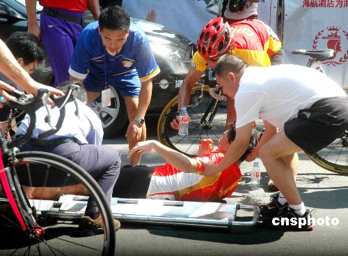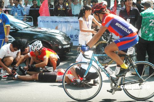 2007年11月6日,“海馬汽車杯”環(huán)海南島國際公路自行車賽進入第三賽段文昌——海口比賽。各國選手在歷經總里程125公里后,快速沖刺設在?谑袨I海大道的終點站時,一名在劃線內的記者突然探頭出來搶拍照片,結果被撞頭破血流,相機摔破,而兩名選手人仰馬翻摔成重傷,另一選手被擦輕傷,當時的驚險場面引起觀賽者一片驚呼聲。中新社發(fā) 善平 攝