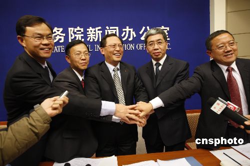 11月26日下午,繞月探測工程領導小組副組長、國防科工委副主任、航天局局長孫來燕(中),繞月探測工程測控系統(tǒng)副總指揮、北京航天飛行控制中心主任朱民才(左二),繞月探測工程副總指揮、航天科技集團公司副總經理雷凡培(右二),中國科學院空間科學與應用中心主任吳季(右)以及國新辦新聞局副局長華清(左),在國務院新聞辦公室舉行的新聞發(fā)布會上,共同慶祝中國首次月球探測工程的圓滿成功。當日,國務院新聞辦公室邀請中國繞月探測工程領導小組副組長、國防科工委副主任、國家航天局局長孫來燕等介紹中國首次月球探測工程等方面情況,并答記者問。中新社發(fā) 杜洋 攝