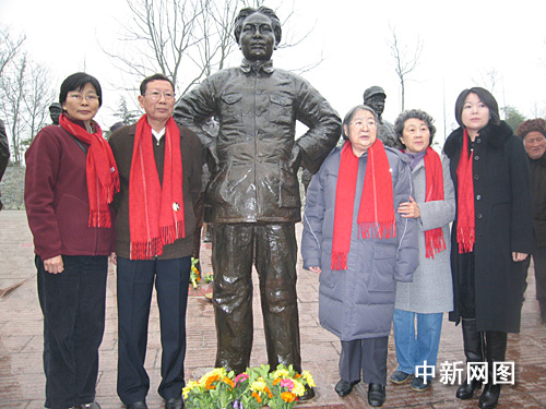 李敏(右三)、孔東梅(右一)、周秉德(周恩來(lái)侄女,右二)、周秉鈞(周恩來(lái)侄子,左二)、劉軍鷹(周恩來(lái)侄媳左一)在毛澤東塑像前合影;蠢柘 攝