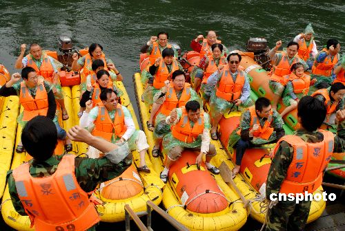 12月30日,一群參加海南萬泉河峽谷漂流的游客在出發(fā)前和工作人員一起宣誓做環(huán)保衛(wèi)士。2008新年到來之際,海南峽谷漂流生意愈加紅火,去五指山峽谷和萬泉河峽谷玩漂流的游客成倍增多。冬季仍如春夏的海南島成為不少人理想的游玩去處。中新社發(fā) 善平 攝