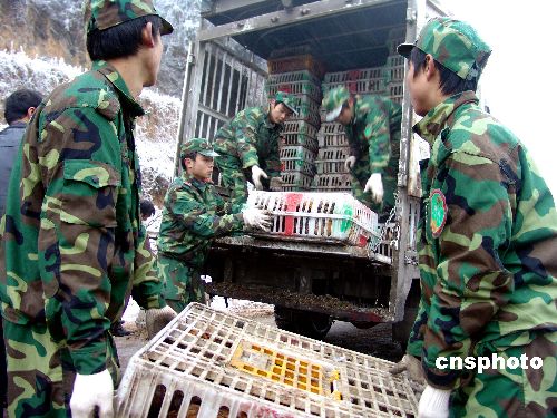 半個(gè)多月的凝凍天氣,使貴州清鎮(zhèn)麥格鄉(xiāng)小谷隴村村萬余只成熟肉雞難以運(yùn)出。1月31日,該市人民武裝部的應(yīng)急民兵緊急出動(dòng),幫助村民及時(shí)將肉雞運(yùn)往收購地點(diǎn)。中新社發(fā) 申時(shí)進(jìn) 攝