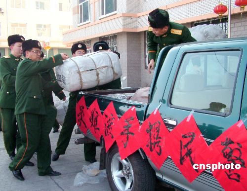 2月3日,黑龍江省武警部隊(duì)牡丹江市邊防支隊(duì)所屬東寧、穆棱、綏芬河三個(gè)邊防縣(市)部隊(duì)官兵,開展為災(zāi)區(qū)人民捐款捐物等抗災(zāi)救助活動(dòng)。中新社發(fā) 莊文斌 攝