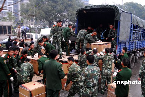 2月4日,雪凝天氣尚未結(jié)束,貴陽地區(qū)又飄起了毛毛細雨,在省政府廣場上,武警戰(zhàn)士在裝運重慶等省市支援貴州的救災(zāi)物資和小型發(fā)電機,準備運往此次雪災(zāi)中受災(zāi)嚴重的黔東南、黔南、銅仁、畢節(jié)等地區(qū)。此次持續(xù)20多天的雪凝凌凍天氣,使貴州省70多個縣市受災(zāi)嚴重,部分縣市停水斷電已近20天。中新社發(fā) 歐陽昌佩 攝