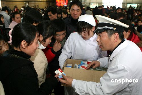 持續(xù)的大范圍災害性雨雪天氣給回鄉(xiāng)過春節(jié)的旅客帶來不便。2月5日,中國海軍上海保障基地派出醫(yī)療隊,冒著嚴寒來到上;疖囌久赓M為旅客送醫(yī)送藥。中新社發(fā) 穆東祥 攝