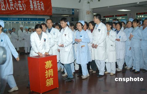 二月五日,北京世紀壇醫(yī)院職工排隊為受災(zāi)的南方省、市衛(wèi)生廳、局捐款。北京衛(wèi)生局四日向全市衛(wèi)生系統(tǒng)發(fā)出緊急通知,號召廣大醫(yī)務(wù)人員向冰雪災(zāi)區(qū)緊急捐款。據(jù)不完全統(tǒng)計,截止五日,已累計捐款四百一十八萬八千元人民幣。這是北京衛(wèi)生系統(tǒng)近年來在捐款活動中,時間最短、數(shù)量最多的一次。中新社發(fā) 曾利明 攝