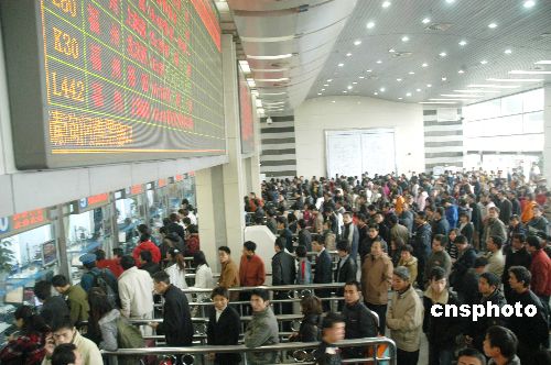 2月14日,福建福州火車站售票大廳內(nèi)排隊購票的旅客排起長龍。由于天氣原因一些無法按時回家過節(jié)的旅客多選擇節(jié)后回家。目前福州開往青島、重慶等地的票源比較緊張。因高校學生開始返校,福州開往南京、北京、上海、沈陽等方向列車,票源也開始緊俏。中新社發(fā) 張 斌 攝
