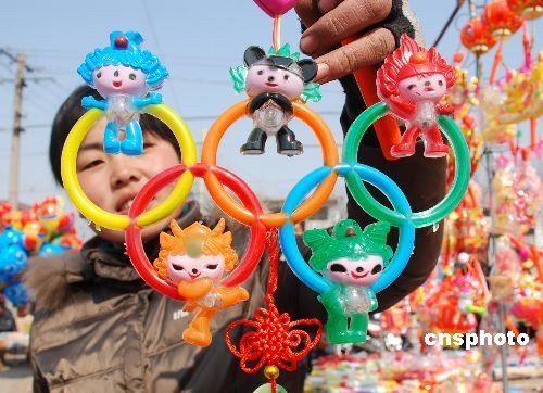 元宵節(jié)臨近,2月15日,在山東棗莊山亭區(qū)農(nóng)村大集上,與奧運(yùn)主題相關(guān)的居室飾品、時尚花燈等商品備受人們青睞,“奧運(yùn)經(jīng)濟(jì)”格外火爆。中新社發(fā) 劉明祥 攝