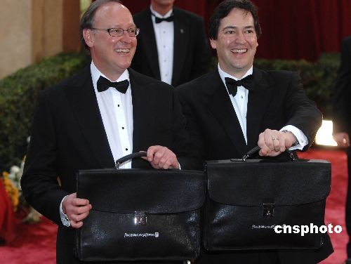 當(dāng)?shù)貢r間2月24日晚,第八十屆奧斯卡頒獎典禮在好萊塢柯達(dá)劇場舉行。在奧斯卡金像獎頒獎典禮開始前,美國普華永道會計事務(wù)所的兩位會計師布萊德(左)和瑞克向記者展示兩個公文包,這里裝的就是奧斯卡各獎項的最終結(jié)果。兩位會計師是最早知道奧斯卡結(jié)果的人。中新社發(fā) 張煒 攝