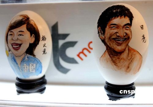 近日,香港世貿(mào)中心以奧運為主題,配合傳統(tǒng)民間藝術(shù)舉辦“復(fù)活蛋藝展”,給香港觀眾帶來充滿特色的蛋藝展覽。三部分二百件的彩繪蛋畫、蛋雕和卵石畫作品栩栩如生。圖為奧運金牌風(fēng)云人物田亮、楊文意蛋雕。中新社發(fā) 洪少葵 攝