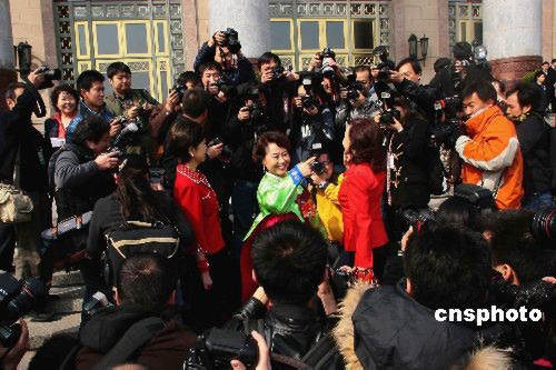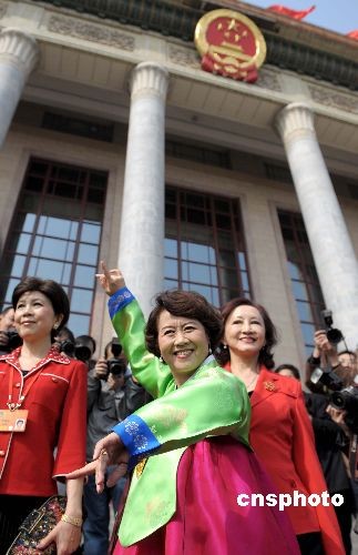 3月14日上午,全國(guó)政協(xié)十一屆一次會(huì)議完成各項(xiàng)議程后在北京人民大會(huì)堂閉幕。朝鮮族委員李承淑興高采烈走出會(huì)場(chǎng),在大會(huì)堂前載歌載舞歡慶大會(huì)圓滿(mǎn)閉幕。