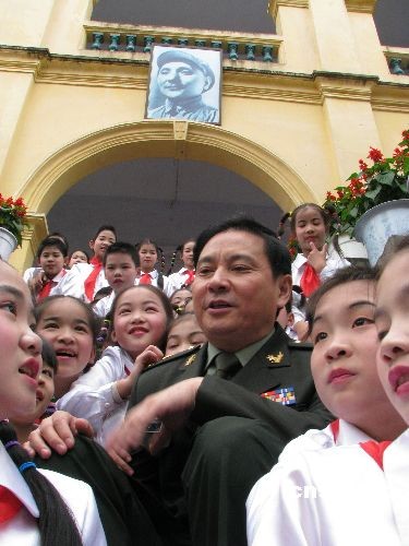 3月19日,中央電視臺(tái)“心連心”藝術(shù)團(tuán)到廣西龍州縣革命老區(qū)慰問演出,圖為鄧小平的扮演者盧奇在紅八軍軍部舊址與當(dāng)?shù)匦W(xué)生親切交談。中新社發(fā) 夏曉弘 攝