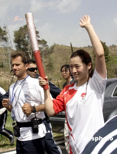 希臘當(dāng)?shù)貢r(shí)間3月24日,北京二00八年奧運(yùn)會(huì)圣火采集儀式在古奧林匹亞競(jìng)技場(chǎng)舉行,隨后火炬希臘傳遞開始。第一位中國(guó)火炬手羅雪娟一邊傳遞圣火一邊向觀眾揮手致意。中新社發(fā) 王歡 攝