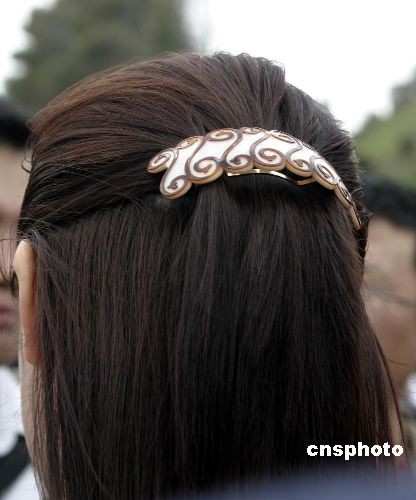 希臘當(dāng)?shù)貢r(shí)間3月24日,北京二00八年奧運(yùn)會圣火采集儀式在古奧林匹亞競技場舉行,隨后火炬希臘傳遞開始。第一位中國火炬手羅雪娟特意佩戴了一個(gè)與北京奧運(yùn)會火炬“祥云”圖案類似的發(fā)卡。中新社發(fā) 王歡 攝