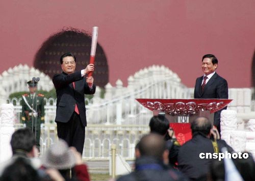 3月31日上午,北京奧運(yùn)會(huì)火炬接力啟動(dòng)儀式在北京天安門廣場(chǎng)舉行,中國國家主席胡錦濤舉起點(diǎn)燃的火炬,向在場(chǎng)的觀眾展示,現(xiàn)場(chǎng)爆發(fā)出熱烈的掌聲和歡呼聲。作者: 張宇