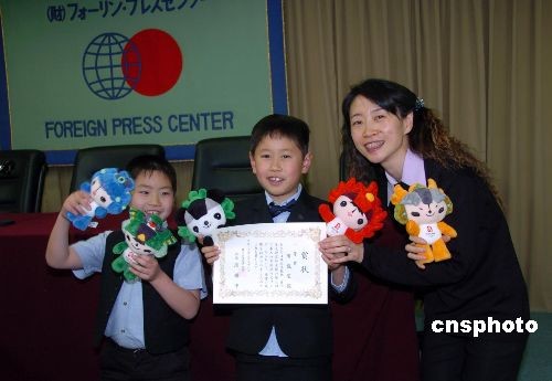 年僅9歲的東京都市立小學(xué)二年級(jí)學(xué)生布施望(中)以《五環(huán)夢(mèng)》為題的漢語作文獲得學(xué)生組一等獎(jiǎng)。中新社發(fā) 段躍中 攝