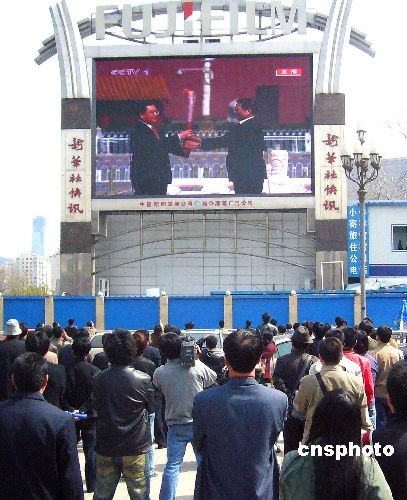 3月31日,北京站旅客在廣場(chǎng)大屏幕前觀看奧運(yùn)圣火傳遞直播。當(dāng)天,2008奧運(yùn)圣火啟動(dòng)儀式在北京天安門(mén)廣場(chǎng)隆重舉行,胡錦濤主席親自點(diǎn)燃了北京奧運(yùn)會(huì)圣火,并宣布奧運(yùn)圣火傳遞正式啟動(dòng)。北京站前廣場(chǎng)大屏幕直播的盛大場(chǎng)面,吸引了眾多旅客駐足觀看。 中新社發(fā) 玉龍 攝