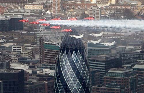 英國皇家空軍4月1日舉行飛行表演,“紅箭”飛行表演隊的飛機(jī)和4架“臺風(fēng)”戰(zhàn)機(jī)飛過倫敦上空,紀(jì)念皇家空軍建立90周年。