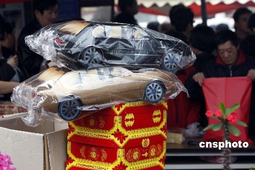 臺(tái)北民眾一早來到陽(yáng)明山第一公墓祭拜祖先,制作精美的紙轎車祭品供亡者在天之靈有個(gè)現(xiàn)代的交通工具。中新社發(fā) 杜洋 攝