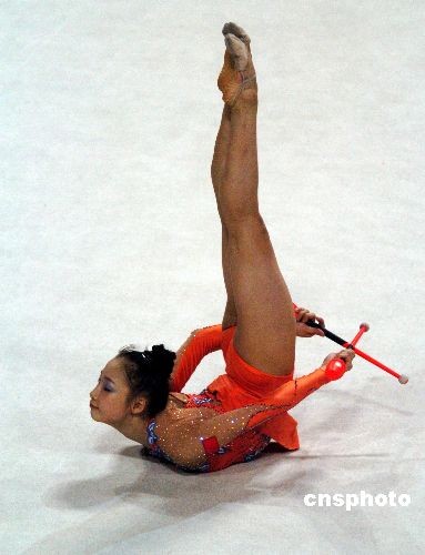 2008年4月6日,全國藝術(shù)體操冠軍賽在深圳體育館進入第三天。由于這是北京奧運前最后一次全國選拔積分賽,因此吸引了來自全國17支隊伍的精英參賽。深圳名將李紅楊在成年組個人全能比賽中獲得金牌。中新社發(fā) 吳峻 攝