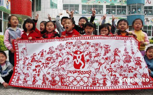 4月7日,幼兒園的小朋友在參觀《華夏兒女喜迎奧運(yùn)圣火》剪紙作品。近日,河南周口軍分區(qū)幼兒園老師陳雪英用兩周的時(shí)間加班制作出了一幅《華夏兒女喜迎奧運(yùn)圣火》的剪紙作品。據(jù)了解,該作品邊長(zhǎng)2.3米,寬0.75米,畫(huà)面上刻有福娃、五環(huán)、火炬、和平鴿和各民族娃娃,整幅作品用國(guó)花牡丹連接而成,四周是一百多個(gè)火炬,象征著奧運(yùn)圣火在全世界巡回傳遞,整幅作品表達(dá)了華夏各族兒女喜迎奧運(yùn)圣火的歡樂(lè)情景。中新社發(fā) 楊正華 攝