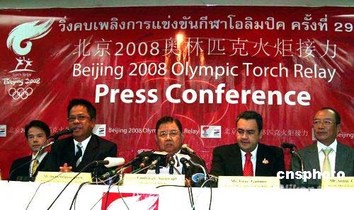 4月17日,泰國奧委會在國家體育館就奧運火炬?zhèn)鬟f活動舉行新聞發(fā)布會。泰國奧委會主席育塔薩先生(中)表示,曼谷為迎接北京奧運會圣火已經(jīng)做好一切準(zhǔn)備。曼谷的火炬?zhèn)鬟f活動將在當(dāng)?shù)貢r間19日下午三點開始;鹁鎸穆忍迫私——耀華叻路起跑,途經(jīng)富有泰國民族文化特色的地點,如大王宮、王家田廣場、民主紀(jì)念碑、五世王紀(jì)念廣場等,全程約10公里。 作者: 顧時宏