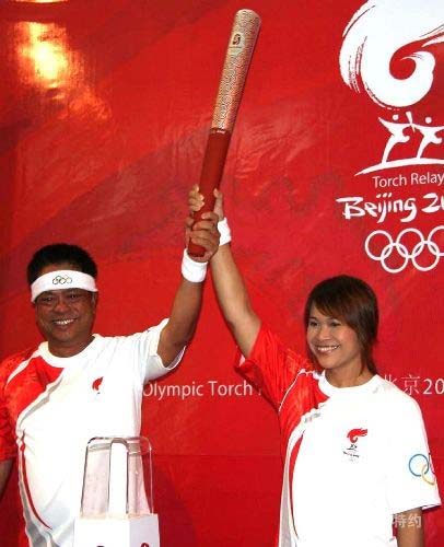 4月17日,泰國奧委會(huì)主席育塔薩先生在泰國國家體育館就奧運(yùn)火炬?zhèn)鬟f活動(dòng)舉行新聞發(fā)布會(huì)上表示,曼谷為迎接北京奧運(yùn)會(huì)圣火已經(jīng)做好一切準(zhǔn)備。圖為北京奧運(yùn)會(huì)火炬?zhèn)鬟f泰國站第一位火炬手曼谷市政府副次長阿南(左)和最后一位火炬手曾獲得奧運(yùn)會(huì)金牌的女子舉重運(yùn)動(dòng)員巴維娜(右)。 作者: 顧時(shí)宏