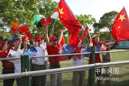 4月17日凌晨0時(shí)55分,北京奧運(yùn)圣火抵達(dá)印度首都新德里,拉開了北京奧運(yùn)圣火“和諧之旅”第十一站的序幕。從17日下午4時(shí)起,傳遞活動(dòng)將在新德里印度總統(tǒng)府和印度門之間的拉吉大街上進(jìn)行。70名火炬手將沿著這條三公里長(zhǎng)的大街傳遞圣火。圖為印度華人華僑在歡迎北京奧運(yùn)圣火。中新社發(fā) 沈晨 攝