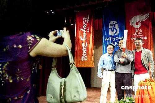 北京奧運(yùn)會(huì)祥云火炬在舊金山展出,華人華僑爭(zhēng)相與祥云合影。陳鋼 攝